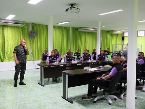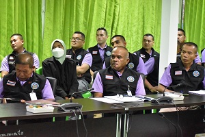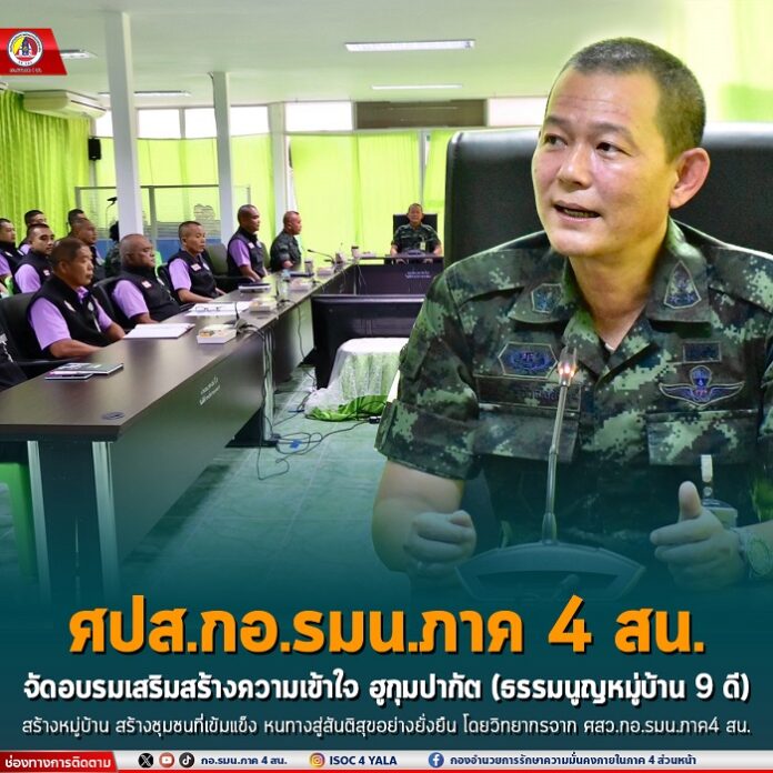 เมื่อวันที่ 14 พฤศจิกายน 2567 เวลา 13.30 น. พันเอก วิริยะ รุจิวณิชย์กุล รองผู้อำนวยการศูนย์ป้องกันและแก้ไขปัญหายาเสพติด กองอำนวยการรักษาความมั่นคงภายในภาค 4 ส่วนหน้า เป็นประธานในการอบรมเสริมสร้างความเข้าใจ ในหัวข้อ ฮูกุมปากัต (ธรรมนูญหมู่บ้าน 9 ดี) เพื่อสร้างการรับรู้ ความเข้าใจ ถึงที่มาและหลักการการดำเนินงาน และสามารถนำไปใช้ในการปฏิบัติงานได้จริงอย่างเป็นรูปธรรม ซึ่งได้เชิญ พันเอก ปฐพี พุทธผล ผู้อำนวยการกองสันติวิธี ศูนย์สันติวิธี กองอำนวยการรักษาความมั่นคงภายในภาค 4 ส่วนหน้า มาบรรยายให้ความรู้ โดยมี กำลังพล และเจ้าหน้าที่ ศูนย์ป้องกันและแก้ไขปัญหายาเสพติด กองอำนวยการรักษาความมั่นคงภายในภาค 4 ส่วนหน้า เข้าร่วมฟังการอบรมอย่างพร้อมเพรียง ณ ห้องประชุม ศูนย์ป้องกันและแก้ไขปัญหายาเสพติด กองอำนวยการรักษาความมั่นคงภายในภาค 4 ส่วนหน้า ตำบลเขาตูม อำเภอยะรัง จังหวัดปัตตานี