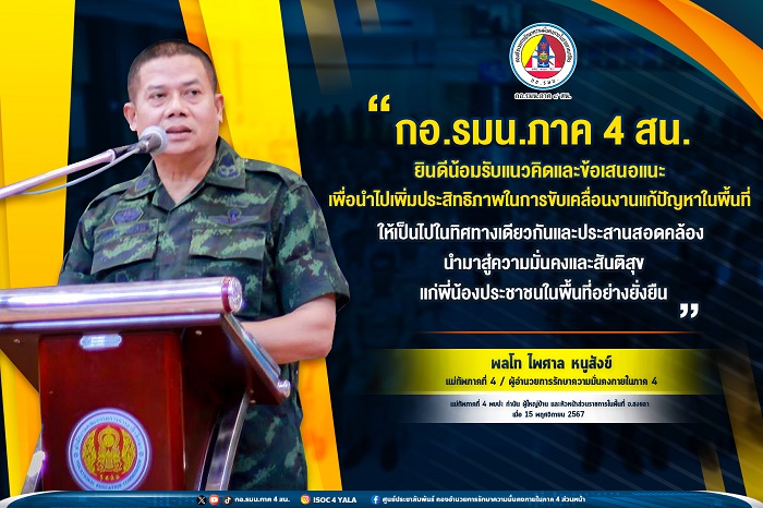 ประชาสัมพันธ์ข่าวประชาสัมพันธ์ กอ.รมน.ภาค 4 สน. ยินดีน้อมรับแนวคิดและข้อเสนอแนะ เพื่อนำไปเพิ่มประสิทธิภาพในการขับเคลื่อนงานแก้ปัญหาในพื้นที่ ให้เป็นไปในทิศทางเดียวกันและประสานสอดคล้อง นำมาสู่ความมั่นคงและสันติสุข แก่พี่น้องประชาชนในพื้นที่อย่างยั่งยืน November 15, 2024 335 Share Facebook Twitter Google+ Telegram LINE พลโท ไพศาล หนูสังข์ แม่ทัพภาคที่ 4 / ผู้อำนวยการรักษาความมั่นคงภายในภาค 4 แม่ทัพภาคที่ 4 พบปะ กํานัน ผู้ใหญ่บ้าน และหัวหน้าส่วนราชการในพื้นที่ จ.สงขลา เมื่อ 15 พฤศจิกายน 2567 ศูนย์ประชาสัมพันธ์กองอำนวยการรักษาความมั่นคงภายในภาค4ส่วนหน้า