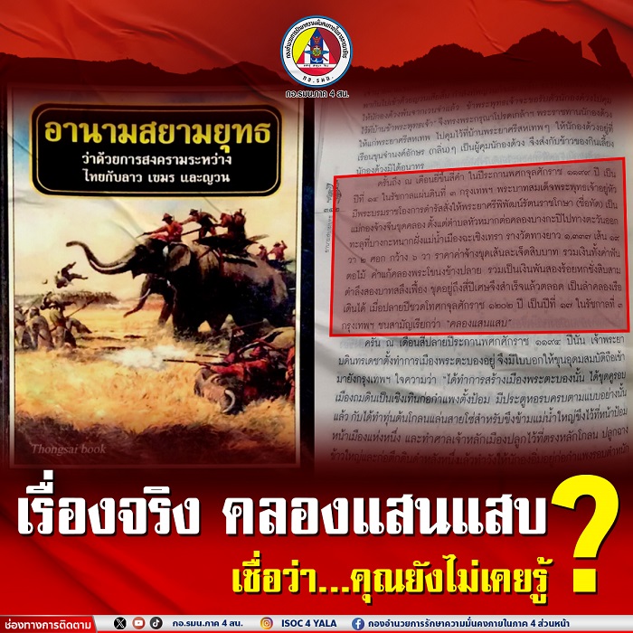 เนื้อความข้างต้นคัดลอกมาจากหนังสือ อานามสยามยุทธ หน้า 342 ซึ่งบ่งบอกถึงความเป็นมาของคลองแสนแสบที่ถูกขุดขึ้นในสมัยรัชกาลที่ 3 โดยการจ้างคนจีนมาทำการขุดคลอง ด้วยเงินงบประมาณแผ่นดินจำนวนมหาศาล และจากคำกล่าวอ้างที่บิดเบือน ว่า “เชลยปัตตานี ซึ่งเป็นบรรพบุรุษของชาวมลายูถูกเจาะร้อยเอ็นร้อยหวาย เดินเท้าจากทางใต้ไปถึงกรุงเทพมหานคร เพื่อให้เป็นแรงงานทาสมาขุดคลองแสนแสบนั้น” คำบอกเล่าเหล่านี้ได้สร้างความบิดเบือนเข้าใจผิดแก่ผู้ได้ยินได้ฟังอีกทั้งยังไม่เคยถูกระบุอยู่ในหน้าประวัติศาสตร์ใดๆเลย เพียงแต่ได้แอบแฝงแพร่กระจายในรูปแบบของการบอกเล่าจากปากต่อปาก โดยไร้ซึ่งหลักฐานอ้างอิงที่พิสูจน์ได้ เป็นการปั้นแต่งเรื่องราวเพื่อให้กลุ่มคนรุ่นหลังเกิดความเข้าใจผิด โดยมีวัตถุประสงค์ให้ผู้รับรู้เกิดความรู้สึกเคียดแค้น ชิงชังสะสม จนอาจก่อให้เกิดความกระด้างกระเดื่อง และวุ่นวาย สมดังเจตนาของผู้ปั้นแต่งเรื่องราวที่หลอกลวง