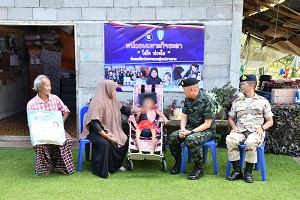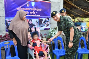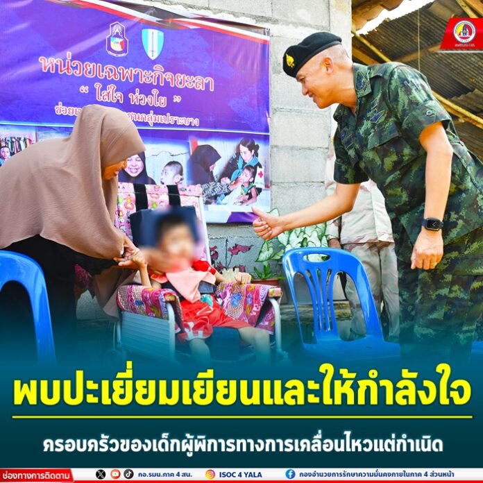 เมื่อวันที่ 16 พฤศจิกายน 2567 เวลา 12.20 น. พลตรี อภินันท์ แจ่มแจ้ง ผู้บังคับหน่วยเฉพาะกิจยะลา และคณะ ลงพื้นที่หมู่ที่ 2 ตำบลวังพญา อำเภอรามัน จังหวัดยะลา เพื่อพบปะเยี่ยมเยียน และให้กำลังใจครอบครัวของ เด็กชาย อัสรี สาเระ ซึ่งเป็นผู้พิการทางการเคลื่อนไหวแต่กำเนิด รวมถึงสอบถามความเป็นอยู่ พร้อมทั้งให้คำแนะนำการดูแลสุขภาพในชีวิตประจำวัน และให้การช่วยเหลือขั้นต้น โดยมี พันเอก พงศกร แสงกุล ผู้บังคับหน่วยเฉพาะกิจกรมทหารพรานที่ 41 พร้อมด้วย หัวหน้าฝ่ายกิจการพลเรือนหน่วยเฉพาะกิจกรมทหารพรานที่ 41 และ หมวดทหารพรานหญิง หน่วยเฉพาะกิจกรมทหารพรานที่ 41 ให้การต้อนรับ