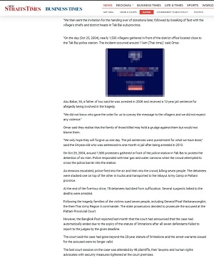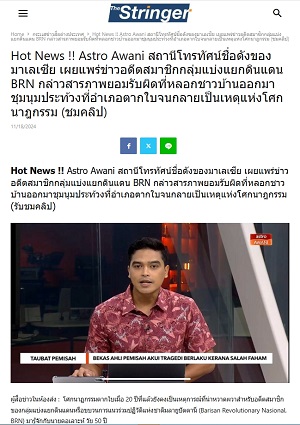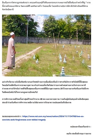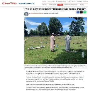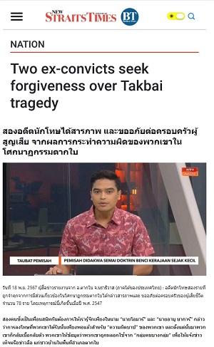 วันที่ 18 พฤศจิกายน 2567 สื่อช่องดังของประเทศมาเลเซีย ทั้งสื่อหนังสือพิมพ์ยักษ์ใหญ่ อย่าง Exclusive !! New Straits Times และ Hot News !! Astro Awani สถานีโทรทัศน์ชื่อดัง ได้เผยแพร่ข่าว เกี่ยวกับความจริงจากเหตุการณ์ชุมนุมประท้วงที่อำเภอตากใบ จังหวัดนราธิวาส โดยมี 2 อดีตนักโทษ กล่าวสารภาพยอมรับผิด และขออภัยต่อครอบครัวของผู้สูญเสีย จำนวน 78 ราย จากผลการกระทำความผิดของพวกเขา ในโศกนาฏกรรมตากใบ เมื่อปี พ.ศ. 2547