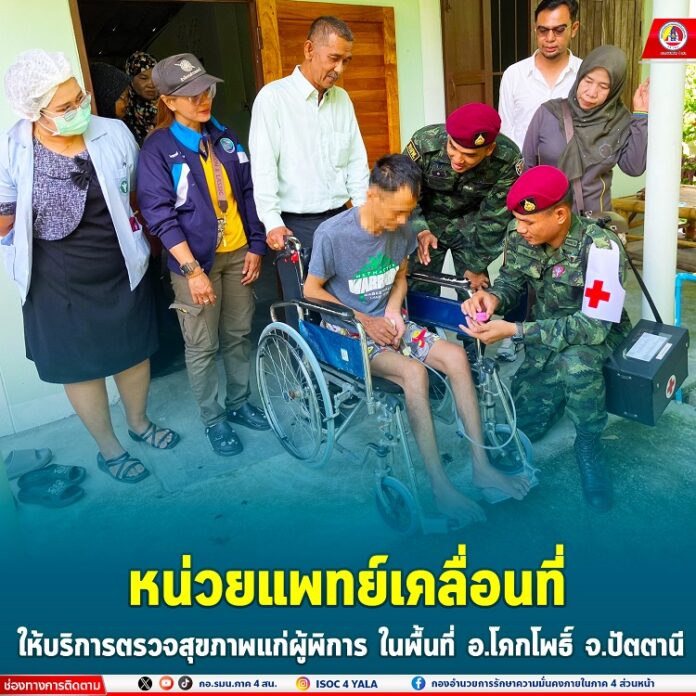 นายยืม กาญจนจันทร์ นายกเทศบาลตำบลโคกโพธิ์ นำทีม หน่วยเฉพาะกิจสันติสุข โดย ชุดเจ้าหน้าที่ สันติสุขที่ 504, เจ้าหน้าที่ชุดทักษิณสัมพันธ์ที่ 551, เจ้าหน้าที่จากกองร้อยทหารพรานที่ 4315 หน่วยเฉพาะกิจกรมทหารพรานที่ 43, เจ้าหน้าที่เทศบาลตำบลโคกโพธิ์, เจ้าหน้าที่โรงพยาบาลส่งเสริมสุขภาพตำบลโคกโพธิ์ และ อาสาสมัครสาธารณสุขประจำหมู่บ้านโคกโพธิ์ ร่วมออกหน่วยแพทย์เคลื่อนที่แก่ผู้พิการ ณ บ้านเลขที่ 142/3 หมู่ที่ 4 บ้านโคกโพธิ์ ตำบลโคกโพธิ์ อำเภอโคกโพธิ์ จังหวัดปัตตานี โดยได้ทำการตรวจรักษาและดูแลรักษาสุขภาพที่จำเป็นให้กับประชาชนในลักษณะแบบผสมผสาน มีทั้งการบริการทางการแพทย์พื้นฐาน ตรวจวัดความแข็งแรงของร่างกาย วัดความดันโลหิต ตรวจรักษาทั่วไป