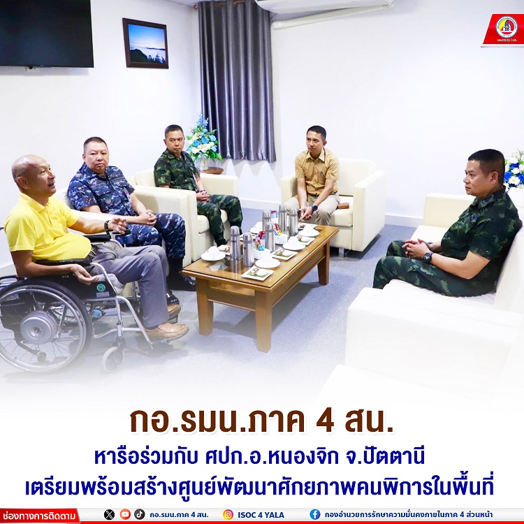 วันนี้ (19 พฤศจิกายน 2567) เวลา 08.15 น. ที่ห้องรวงผึ้ง กองอำนวยการรักษาความมั่นคงภายในภาค 4 ส่วนหน้า ค่ายสิรินธร ตำบลเขาตูม อำเภอยะรัง จังหวัดปัตตานี พลโท ไพศาล หนูสังข์ แม่ทัพภาคที่ 4 / ผู้อำนวยการรักษาความมั่นคงภายในภาค 4 ให้การต้อนรับ นายนูรดี อับดุลราฮิม นายอำเภอหนองจิก / ผู้อำนวยการศูนย์ปฏิบัติการอำเภอหนองจิก จังหวัดปัตตานี พร้อมคณะ ซึ่งขอเข้าพบปะ หารือ ร่วมกับแม่ทัพภาคที่ 4 เพื่อเตรียมความพร้อมในการจัดศูนย์พัฒนาศักยภาพคนพิการจังหวัดชายแดนภาคใต้ ยกระดับคุณภาพชีวิตแก่ผู้พิการในพื้นที่ โดยมี คณะผู้บังคับบัญชา กองอำนวยการรักษาความมั่นคงภายในภาค 4 ส่วนหน้า ที่เกี่ยวข้อง ร่วมให้การต้อนรับ