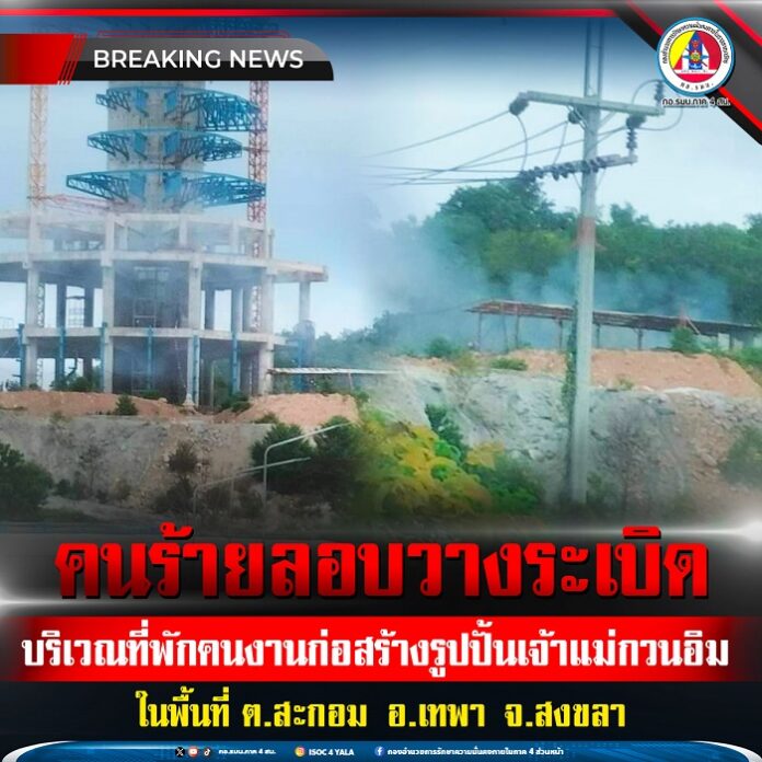 วันนี้ (20 พฤศจิกายน 2567) เวลาประมาณ 06.00 น. เกิดเหตุคนร้ายลอบวางระเบิดบริเวณที่พักคนงานก่อสร้างรูปปั้นเจ้าแม่กวนอิม เบื้องต้นยังไม่ทราบผู้เสียชีวิต / บาดเจ็บ เหตุเกิดในพื้นที่ หมู่ที่ 1 ตำบลสะกอม อำเภอเทพา จังหวัดสงขลา รายละเอียดเพิ่มเติมจะแจ้งให้ทราบต่อไป
