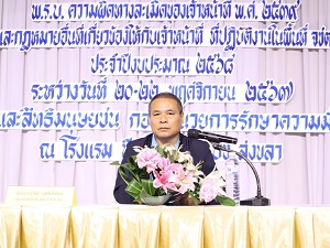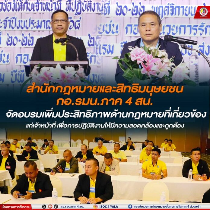 วันนี้ (20 พฤศจิกายน 2567) เวลา 09.00 น.ที่ โรงแรมบีพี สมิหลา บีช รีสอร์ท อำเภอเมือง จังหวัด สงขลา พันเอก ชำนาญ กิจเวช รองเลขาธิการ กองอำนวยการรักษาความมั่นคงภายในภาค 4 ส่วนหน้า เป็นประธานพิธีเปิดการอบรมโครงการการเพิ่มประสิทธิภาพการบริหารการจัดการภาครัฐการพัฒนากลไกภาครัฐและการพัฒนาเจ้าหน้าที่ รายการเสริมสร้างความรู้ความเข้าใจเกี่ยวกับ พ.ร.บ. ความรับผิดทางละเมิดของเจ้าหน้าที่ พ.ศ. 2539 และกฎหมายอื่นที่เกี่ยวข้อง ให้กับเจ้าหน้าที่ที่ปฏิบัติงานในพื้นที่ จชต. ประจำปีงบประมาณ 2568 จัดขึ้นระหว่างวันที่ 20 – 22 พฤศจิกายน 2567 เพื่อสร้างความรู้ความเข้าใจเกี่ยวกับพระราชบัญญัติความรับผิดทางละเมิด ของเจ้าหน้าที่ พ.ศ. 2539 และระเบียบสำนักนายกรัฐมนตรี ว่าด้วย หลักเกณฑ์การปฏิบัติเกี่ยวกับความรับผิดทางละเมิดของเจ้าหน้าที่ พ.ศ. 2539 เพื่อสร้างความรู้ความเข้าใจในการปฏิบัติตามระเบียบกองอำนวยการรักษาความมั่นคงภายในราชอาณาจักร ว่าด้วยการจำหน่ายพัสดุ พ.ศ. 2555 ตลอดจนสร้างความเข้าใจในแนวทางการสอบข้อเท็จจริงความรับผิดทางละเมิดของเจ้าหน้าที่ โดยมี พันตำรวจเอก จารุวิทย์ วงศ์ชัยกิตติพร รองผู้อำนวยการ สำนักกฎหมายและสิทธิมนุษยชน กองอำนวยการรักษาความมั่นคงภายในภาค 4 ส่วนหน้า และผู้เข้าร่วมประชุมฯ ประกอบด้วย ข้าราชการทหาร ตำรวจ ที่ปฏิบัติงานอยู่ภายใต้โครงสร้างของ กองอำนวยการรักษาความมั่นคงภายในภาค 4 ส่วนหน้า จำนวน 142 นาย