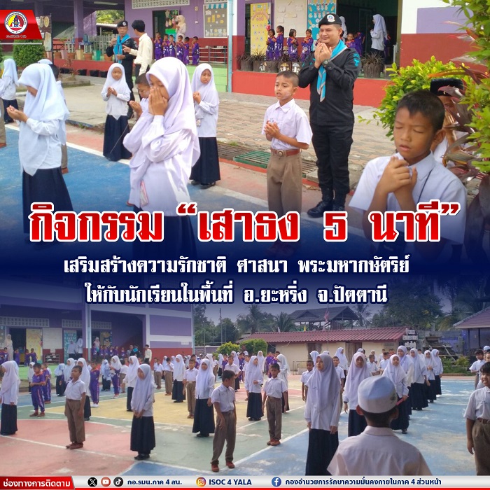 เมื่อวันที่ 19 พฤศจิกายน 2567 เวลา 08.30 น. หน่วยเฉพาะกิจกรมทหารพรานที่ 42 โดย ชุดปฏิบัติการกิจการพลเรือน กองร้อยทหารพรานที่ 4201 ลงพื้นที่ โรงเรียนบ้านบาโลย หมู่ที่ 3 ตำบลบาโลย อำเภอยะหริ่ง จังหวัดปัตตานี เข้าพบปะพูดคุยพัฒนาสัมพันธ์กับครูและนักเรียนโรงเรียนบ้านบาโลย เพื่อเสริมสร้างความสัมพันธ์อันดีต่อกัน พร้อมร่วมทำกิจกรรม “เสาธง 5 นาที” นำนักเรียนร้องเพลงชาติ เชิญธงชาติขึ้นสู่ยอดเสา ร้องเพลงสรรเสริญพระบารมี และประกอบพิธีทางศาสนา เพื่อปลุกจิตสำนึกให้เด็ก เยาวชน รู้คุณชาติ ศาสนา พระมหากษัตริย์ ปฏิบัติตน อยู่ในกรอบของกฎหมาย ยึดหลัก “ความสงบ ความสันติ และรู้ รัก สามัคคี” ตลอดจนปกป้องชาติ ศาสนา พระมหากษัตริย์ ให้สามสถาบันหลักของชาติเป็นศูนย์รวมจิตใจของปวงชนในชาติ และสามารถดำรงอยู่คู่กับประชาธิปไตยอย่างมั่นคงต่อไป