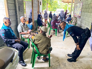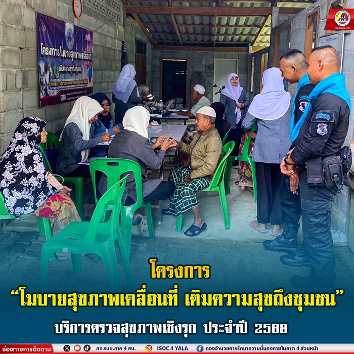 หน่วยเฉพาะกิจกรมทหารพรานที่ 44 จัดกำลังพลชุดปฏิบัติการกิจการพลเรือน (ชป.กร.) กองร้อยทหารพรานที่ 4407 ร่วมกับผู้ใหญ่บ้าน เจ้าหน้าที่สาธารณสุข และอาสาสมัครสาธารณสุขประจำหมู่บ้าน (อสม.) ลงพื้นที่เข้าพบปะประชาชนที่เข้าร่วมโครงการ “โมบายสุขภาพเคลื่อนที่ เติมความสุขถึงชุมชน“ (บริการตรวจสุขภาพเชิงรุก ประจำปี 2568) โดยการตรวจคัดกรองเบาหวาน,ความดันโลหิตสูง และไขมัน แบบเชิงรุกในพื้นที่ ณ ที่ทำการผู้ใหญ่บ้าน หมู่ที่ 2 บ้านกาแระ ตำบลมะนังดาลำ อำเภอสายบุรี จังหวัดปัตตานี