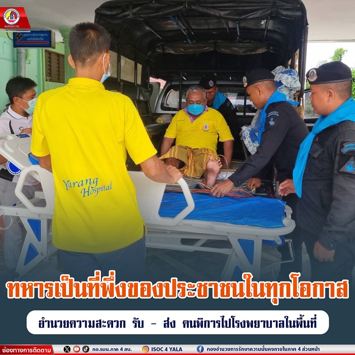 หน่วยเฉพาะกิจกรมทหารพรานที่ 22 โดย กองร้อยทหารพรานที่ 2204 จัดกำลังพลชุดปฏิบัติการกิจการพลเรือน เข้าช่วยเหลือ และอำนวยความสะดวกนำส่ง นายมิตร รัตนเหม ซึ่งเป็นผู้ป่วยติดเตียง ในพื้นที่ บ้านม่วงหมัง ตำบลเมาะมาวี อำเภอยะรัง จังหวัดปัตตานี เข้ารับการรักษาที่โรงพยาบาลยะรัง เพื่อเข้าตรวจอาการของโรคประจำตัวตามใบนัดของแพทย์ และเป็นไปตามนโยบายของผู้บังคับหน่วยเฉพาะกิจกรมทหารพรานที่ 22 เมื่อมีประชาชนที่ได้รับความเดือดร้อน รีบให้การช่วยเหลือ บรรเทาทุกข์ในทันที เราคือทหารของประชาชน ประชาชนคือพี่น้องเรา