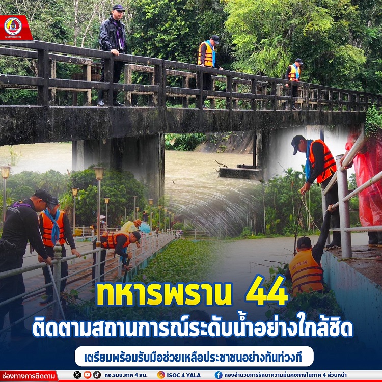 หน่วยเฉพาะกิจกรมทหารพรานที่ 44 โดย กองร้อยหน่วยขึ้นตรงได้จัดกำลังพล ลงพื้นที่ติดตามสถานการณ์ระดับน้ำในคลองชลประทาน และจุดเฝ้าระวังต่างๆ ในพื้นที่ อำเภอสายบุรี อำเภอทุ่งยางแดง อำเภอกะพ้อ อำเภอไม้แก่น จังหวัดปัตตานี เนื่องจากห้วงนี้มีฝนตกหนักอย่างต่อเนื่อง ทำให้น้ำมีปริมาณมาก เพื่อประเมินเตรียมความพร้อมในการรับมือกับอุทกภัย และสามารถเข้าช่วยเหลือประชาชน ได้อย่างทันท่วงทีหากเกิดน้ำท่วมฉับพลัน