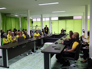 วันที่ 23 พฤศจิกายน 2567 เวลา 09.30 น. พันเอก วิริยะ รุจิวณิชย์กุล รองผู้อำนวยการศูนย์ป้องกันและแก้ไขปัญหายาเสพติด กองอำนวยการรักษาความมั่นคงภายในภาค 4 ส่วนหน้า เป็นประธานในการอบรมเสริมสร้างความเข้าใจ ในหัวข้อ ฮูกุมปากัต (ธรรมนูญหมู่บ้าน 9 ดี) ครั้งที่ 2 ให้กับมวลชนญาลันนันบารู เพื่อสร้างการรับรู้ ความเข้าใจ ถึงที่มาและหลักการการดำเนินงาน และสามารถนำไปใช้ในการปฏิบัติงานได้จริงอย่างเป็นรูปธรรม ซึ่งได้เชิญ พันเอก ปฐพี พุทธผล ผู้อำนวยการกองสันติวิธี ศูนย์สันติวิธี กองอำนวยการรักษาความมั่นคงภายในภาค 4 ส่วนหน้า มาบรรยายให้ความรู้ โดยมี เจ้าหน้าที่วิทยากรญาลันนันบารู และโค้ชญาลันนันบารู ของทั้ง 3 จังหวัดและ 4 อำเภอ เข้าร่วมฟังการอบรมอย่างพร้อมเพรียง ณ ห้องประชุม ศูนย์ป้องกันและแก้ไขปัญหายาเสพติด กองอำนวยการรักษาความมั่นคงภายในภาค 4 ส่วนหน้า ตำบลเขาตูม อำเภอยะรัง จังหวัดปัตตานี