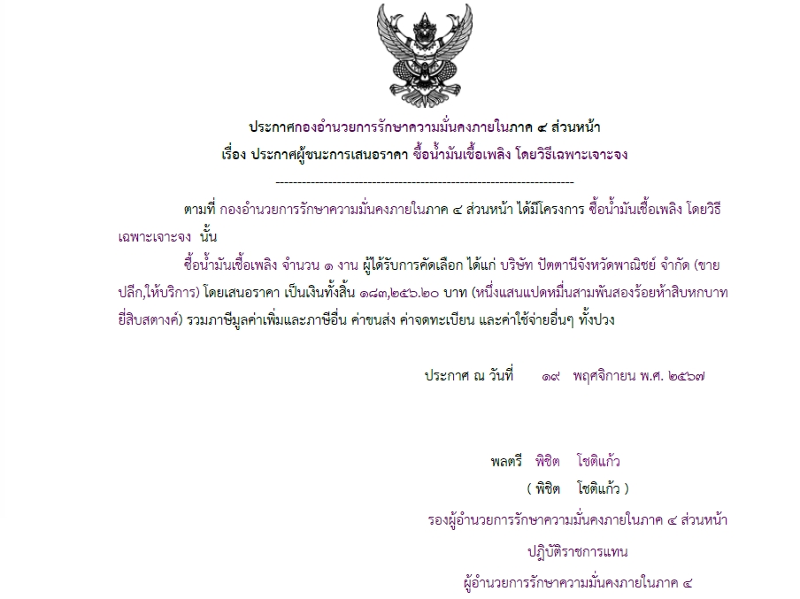 ประกาศผู้ชนะการเสนอราคา ซื้อน้ำมันเชื้อเพลิง โดยวิธีเฉพาะเจาะจง
