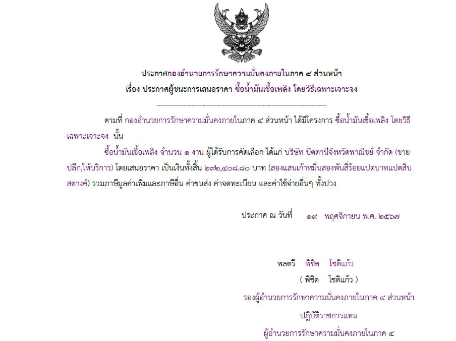 ประกาศผู้ชนะการเสนอราคา ซื้อน้ำมันเชื้อเพลิง โดยวิธีเฉพาะเจาะจง