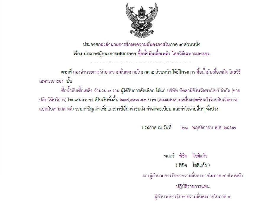 ประกาศผู้ชนะการเสนอราคา ซื้อน้ำมันเชื้อเพลิง โดยวิธีเฉพาะเจาะจง