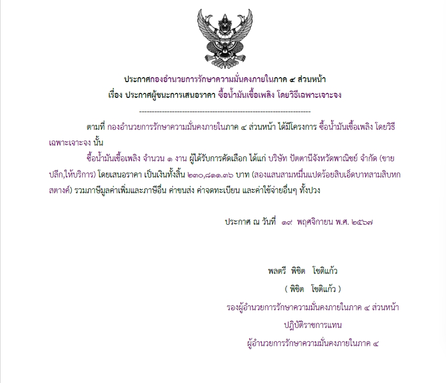 ประกาศผู้ชนะการเสนอราคา ซื้อน้ำมันเชื้อเพลิง โดยวิธีเฉพาะเจาะจะจง