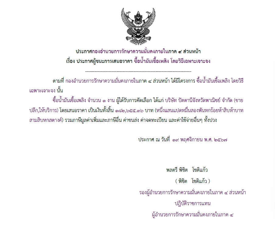 ประกาศผู้ชนะการเสนอราคา ซื้อน้ำมันเชื้อเพลิง โดยวิธีเฉพาะเจาะจะจง
