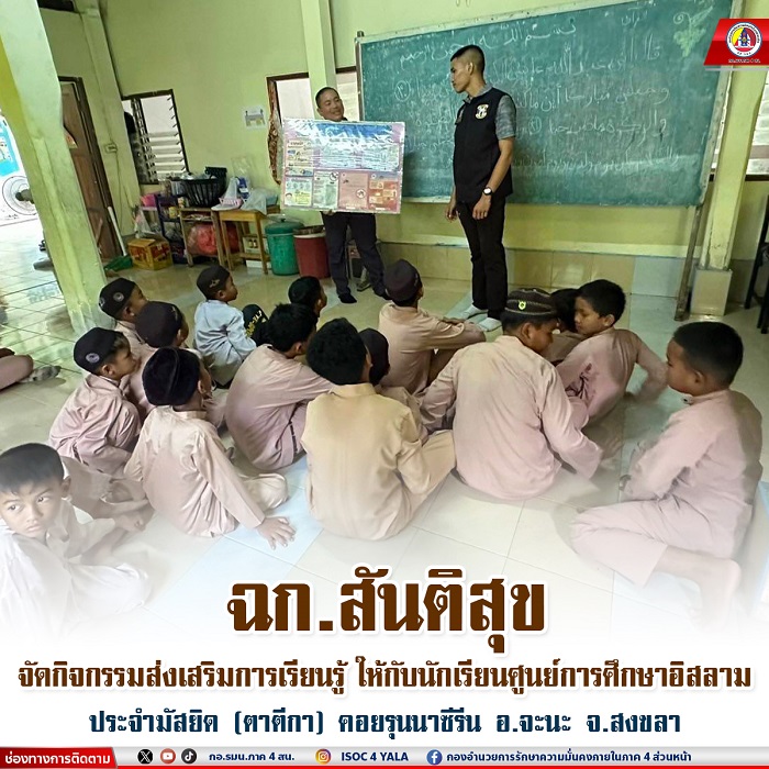 หน่วยเฉพาะกิจสันติสุข โดย ชุดสันติสุขที่ 501 ลงพื้นที่จัดกิจกรรมส่งเสริมการเรียนรู้ให้กับเด็กนักเรียนศูนย์การศึกษาอิสลาม ประจำมัสยิด (ตาตีกา) คอยรุนนาซีรีน หมู่ที่ 7 บ้านลางา ตำบลบ้านนา อำเภอจะนะ จังหวัดสงขลา เพื่อส่งเสริมสร้างการเรียนรู้ ปลูกฝังความคิดริเริ่มสร้างสรรค์ประสบการณ์ชีวิต และทักษะการอยู่ร่วมกันกับผู้อื่น พร้อมทั้งมอบข้าวโพดกระป๋องจากกองอำนวยการรักษาความมั่นคงภายในภาค 4 ส่วนหน้า ที่แจกจ่ายให้กับกำลังพลหน่วยขึ้นตรง โดยได้รับจากมูลนิธิสโกลารส์ ออฟ ซัสทีแนนซ์ ประเทศไทย (มูลนิธิเอสโอเอส) ส่งผลิตภัณฑ์ข้าวโพดกระป๋องสำเร็จรูปโดยรถไฟ อีกทั้งได้ให้ความรู้ แนะนำการป้องกันตนเองจากโรคไข้เลือดออกซึ่งมียุงลายเป็นพาหะนำโรค ให้กับบุคลากรทางการศึกษาและนักเรียน เพื่อเสริมสร้างความเข้าใจและรู้จักวิธีการป้องกันตนเองให้รอดพ้นจากยุงลายที่เป็นพาหะนำโรค เนื่องจากช่วงนี้เริ่มเข้าสู่ฤดูฝนด้วย