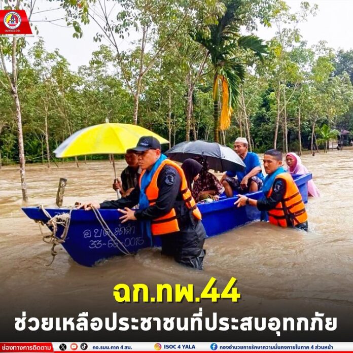 หน่วยเฉพาะกิจกรมทหารพรานที่ 44 จัดกำลังพลกองร้อยหน่วยขึ้นตรง ร่วมกับผู้นำท้องที่ เข้าให้การช่วยเหลือประชาชนในพื้นที่ประสบอุทกภัย ประกอบด้วย อำเภอสายบุรี, อำเภอกะพ้อ อำเภอทุ่งยางแดง และอำเภอไม้แก่น จังหวัดปัตตานี โดยการขนย้ายสิ่งของขึ้นที่สูงและเคลื่อนย้ายผู้ประสบภัยน้ำท่วมฉับพลัน อย่างปลอดภัย สืบเนื่องจากห้วงนึ้มีฝนตกหนักลงมาอย่างต่อเนื่อง เป็นเหตุทำให้น้ำท่วมขังเข้าบ้านเรือนประชาชนเป็นจำนวนมาก ขอให้ประชาชนเฝ้าระวัง และติดตามระดับน้ำที่เพิ่มสูงขึ้น หากต้องการความช่วยเหลือประสานไปยังหน่วยทหารในพื้นที่ใกล้บ้านได้ตลอด 24 ชั่วโมง ทั้งนี้ หน่วยเฉพาะกิจกรมทหารพรานที่ 44 มีการเตรียมพร้อม และเฝ้าระวังประเมินสถานการณ์พร้อมจัดกำลังพล เข้าให้การช่วยเหลือประชาชนที่ประสบภัย อย่างทันท่วงที