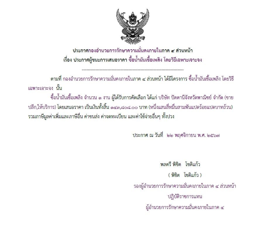 ประกาศผู้ชนะการเสนอราคา ซื้อน้ำมันเชื้อเพลิง โดยวิธีเฉพาะเจาะจง