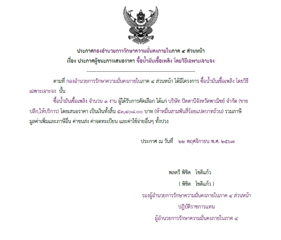 ประกาศผู้ชนะการเสนอราคา ซื้อน้ำมันเชื้อเพลิง โดยวิธีเฉพาะเจาะจง