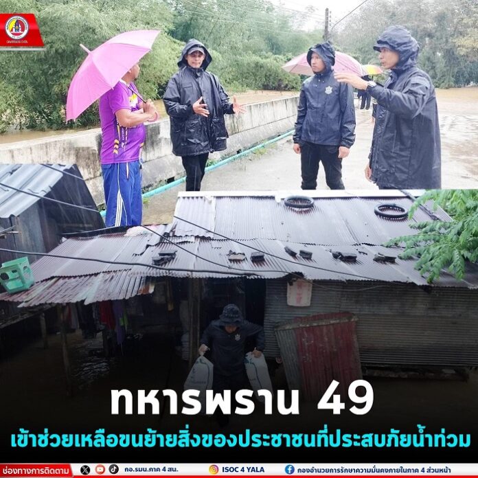 กองร้อยทหารพรานที่ 4914 หน่วยเฉพาะกิจกรมทหารพรานที่ 49 จัดกำลังพลชุดปฏิบัติการกิจการพลเรือน ร่วมกับ ผู้นำท้องที่บ้านยะออ หมู่ที่ 1 และบ้านจะแนะ หมู่ที่ 2 ตำบลจะแนะ อำเภอจะแนะ จังหวัดนราธิวาส ช่วยขนย้ายของขึ้นที่สูงให้กับประชาชนผู้ประสบภัย พร้อมตรวจสอบระดับน้ำในพื้นที่ ตลอดจนได้สำรวจบ้านเรือนประชาชนที่ได้รับผลกระทบจากอุทกภัย เนื่องจากฝนตกติดต่อกันหลายวัน ณ บ้านยะออ หมู่ที่ 1 บ้านจะแนะ หมู่ที่ 2 ตำบลจะแนะ อำเภอจะแนะ จังหวัดนราธิวาส ซึ่งระดับน้ำในพื้นที่ยังอยู่ในเกณฑ์ที่ต้องเฝ้าระวัง ขณะนี้หน่วยยังคงเฝ้าระวังและติดตามเพื่อให้การช่วยเหลือพี่น้องประชาชนต่อไป