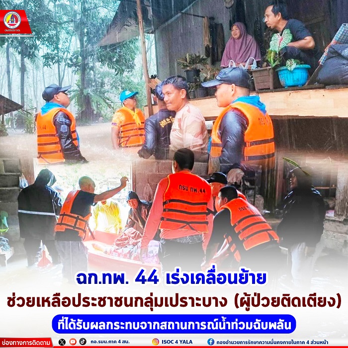 วันที่ 28 พฤศจิกายน 2567 หน่วยเฉพาะกิจกรมทหารพรานที่ 44 จัดกำลังพลของกองร้อย หน่วยขึ้นตรง ร่วมกับผู้นำชุมชน และส่วนราชการในพื้นที่ เข้าให้การช่วยเหลือ เคลื่อนย้ายประชาชนกลุ่มผู้ป่วยติดเตียงออกจากพื้นที่ประสบเหตุอุทกภัย จำนวน 2 ราย เพื่อให้เกิดความปลอดภัยสูงสุด ในพื้นที่ ตำบลเตราะบอน อำเภอสายบุรี จัวหวัดปัตตานี