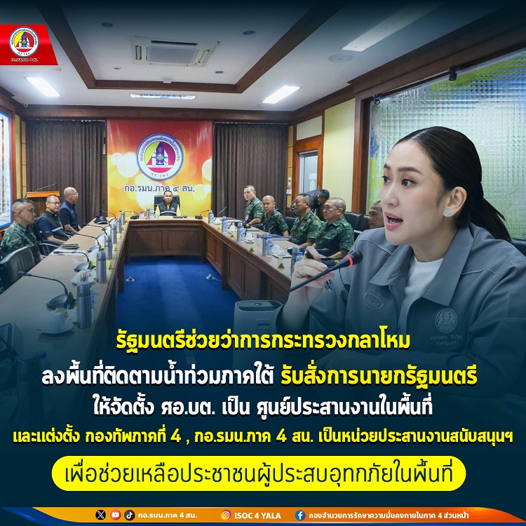 “ในที่ประชุมฯ พลเอก ณัฐพล นาคพานิชย์ รัฐมนตรีช่วยว่าการกระทรวงกลาโหม ได้นำความห่วงใยจาก นางสาวแพรทองธาร ชินวัตร นายกรัฐมนตรี มายังพี่น้องประชาชนในพื้นที่ภาคใต้ที่ประสบอุทกภัย โดยสั่งการให้มาติดตามสถานการณ์อุทกภัยในพื้นที่ภาคใต้ ซึ่งจากการประเมิน และติดตามการบริหารจัดการสถานการณ์อุทกภัยในพื้นที่จังหวัดชายแดนภาคใต้ ทั้ง 4 จังหวัด ยะลา ปัตตานี นราธิวาส และสงขลา ที่ผ่านมานั้น ควรมีศูนย์ประสานงานในพื้นที่ เนื่องจากที่ผ่านมาดำเนินการภายใต้ศูนย์การบริหารปฏิบัติการช่วยเหลือผู้ประสบอุทกภัย วาตภัย และดินโคลนถล่ม หรือ ศปช. ส่วนกลาง และเพื่อให้การบริหารจัดการที่มีประสิทธิผลมากขึ้น ทั้งนี้นายกรัฐมนตรี สั่งการ มอบหมายจัดตั้งให้ศูนย์อำนวยการบริหารจังหวัดชายแดนภาคใต้ เป็นศูนย์ประสานงานสถานการณ์อุทกภัยในพื้นที่จังหวัดชายแดนภาคใต้ เป็นหน่วยงานแกนกลางที่บูรณาการทั้งหมดในการช่วยเหลือ และมอบหมายให้กองทัพภาคที่ 4 และกองอำนวยการรักษาความมั่นคงภายในภาค 4 ส่วนหน้า เป็นศูนย์กลางการประสานงานระหว่างหน่วยงานต่างๆเพื่อสนับสนุนศูนย์อำนวยการบริหารจังหวัดชายแดนภาคใต้ในการช่วยเหลือพี่น้องประชาชนที่ได้รับผลกระทบจากอุทกภัย