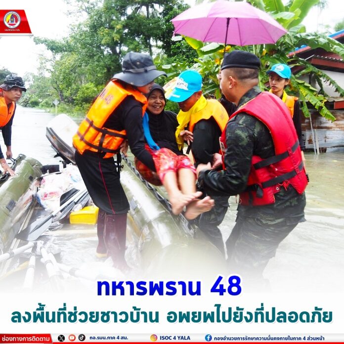 ทั้งนี้หน่วยเฉพาะกิจกรมทหารพรานที่ 48 ได้เฝ้าติดตามสถานการณ์น้ำในพื้นที่อย่างใกล้ชิด เนื่องจากมีฝนตกอย่างต่อเนื่อง และมีน้ำท่วมบ้านเรือนของประชาชนเป็นจำนวนมาก พร้อมทั้งแจ้งประชาชนในพื้นที่ หากประสบภัยพิบัติต่างๆ สามารถแจ้งขอความช่วยเหลือจากหน่วยทหารในพื้นที่ได้ตลอด 24 ชม.