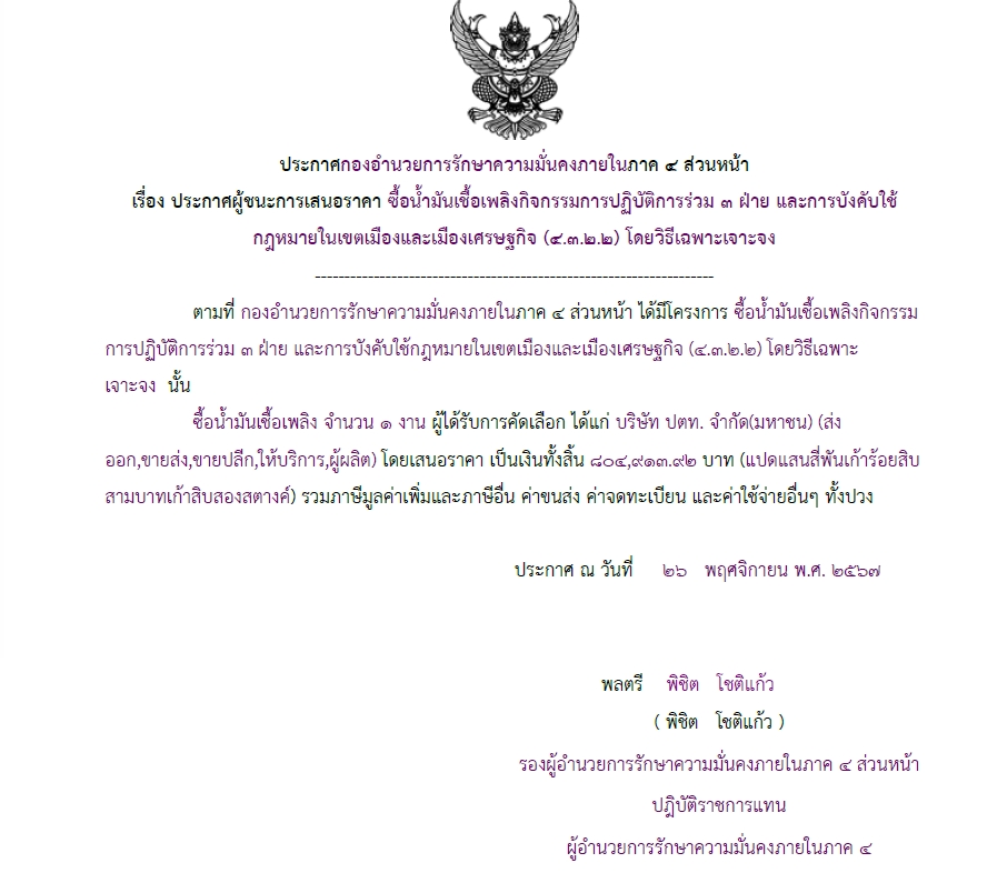 จัดซื้อ จัดจ้างประกาศผู้ชนะการเสนอราคา ประกาศผู้ชนะการเสนอราคา ซื้อน้ำมันเชื้อเพลิงกิจกรรมการปฏิบัติการร่วม ๓ ฝ่าย และการบังคับใช้กฎหมายในเขตเมืองและเมืองเศรษฐกิจ (๔.๓.๒.๒) โดยวิธีเฉพาะเจาะจง November 30, 2024 268 Share Facebook Twitter Google+ Telegram LINE