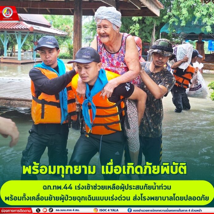 วันที่ 29 พฤศจิกายน 2567 หน่วยเฉพาะกิจกรมทหารพรานที่ 44 นำโดย รองผู้บังคับหน่วยเฉพาะกิจกรมทหารพรานที่ 44 นำกำลังพลจิตอาสาพระราชทานของหน่วยฯ เข้าช่วยเหลือผู้ประสบภัยน้ำท่วม ผู้ป่วยติดเตียง พร้อมทั้งเคลื่อนย้ายผู้ป่วยฉุกเฉินแบบเร่งด่วน จากโรงพยาบาลสายบุรี ไปยัง โรงพยาบาลปัตตานี โดยปลอดภัย พร้อมทั้งประชาสัมพันธ์หากประสบภัยพิบัติต่างๆ สามารถแจ้งขอความช่วยเหลือผ่านสายด่วน หน่วยเฉพาะกิจกรมทหารพรานที่ 44 โทร. 073-419526 ได้ตลอด 24 ชั่วโมง อย่างไรก็ตามหน่วยทหารพร้อมเป็นทหารพระราชา ร่วมดูแลสุขทุกข์ ช่วยเหลือบรรเทาความเดือดร้อน เพราะทหาร “ไม่ทอดทิ้งประชาชน”