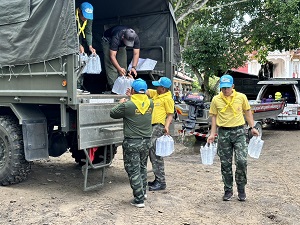 วันที่ 1 ธันวาคม 2567 “ทหารช่างจิตอาสากองทัพบก” ร่วมกับ คุณสมฤดี ขำเขียว ประธานสมาคมแม่บ้านทหารบก กองพลทหารราบที่ 15 และคณะ ลงพื้นที่แจกจ่ายน้ำดื่มสะอาด จำนวน 800 ขวด ให้แก่ประชาชนที่ประสบภัยน้ำท่วมในหลายพื้นที่ อำเภอหนองจิก จังหวัดปัตตานี และศูนย์พักพิงวัดตุยง หลังจากที่เกิดฝนตกหนักต่อเนื่อง ส่งผลให้ระดับน้ำในแม่น้ำหลายสายเอ่อล้นเข้าท่วมบ้านเรือนประชาชนและพื้นที่การเกษตร พร้อมทั้งแจกจ่ายข้าวครัวสนามกองทัพบก เพื่อบรรเทาความเดือดร้อนในยามวิกฤต