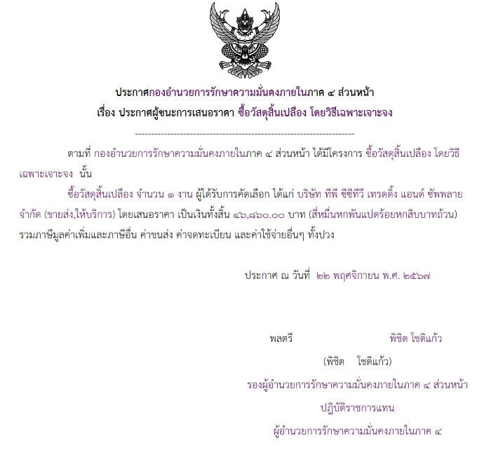 ประกาศผู้ชนะการเสนอราคา ชื่อวัสดุสิ้นเปลือง โดยวิธีเฉพาะเจาะจง