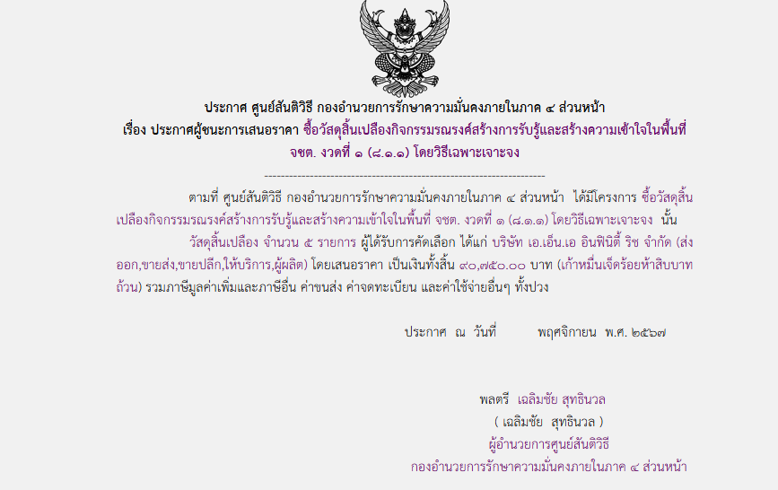 จัดซื้อ จัดจ้างประกาศผู้ชนะการเสนอราคา ประกาศผู้ชนะการเสนอราคา ซื้อวัสดุสิ้นเปลืองกิจกรรมรณรงค์สร้างการรับรู้และสร้างความเข้าใจในพื้นที่ จชต. งวดที่ ๑ (๘.๑.๑) โดยวิธีเฉพาะเจาะจง December 4, 2024 287 Share Facebook Twitter Google+ Telegram LINE
