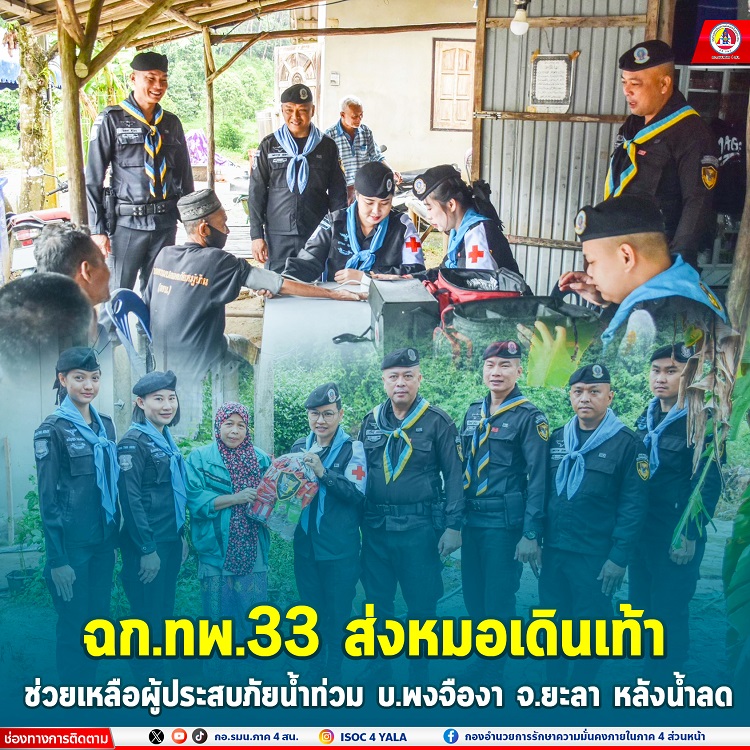 วันที่ 4 ธันวาคม 2567 เวลา 09.00 น. หน่วยเฉพาะกิจกรมทหารพรานที่ 33 (ฉก.ทพ.33) นำโดย พันเอก สุริยา ผาสุข ผู้บังคับหน่วยเฉพาะกิจกรมทหารพรานที่ 33 ได้จัดกำลังพลชุดหมอเดินเท้า ร่วมกับผู้นำหมู่บ้านและผู้นำชุมชน ลงพื้นที่ บ้านพงจืองา ตำบลตลิ่งชัน อำเภอบันนังสตา จังหวัดยะลา เพื่อให้ความช่วยเหลือประชาชนที่ได้รับผลกระทบจากเหตุอุทกภัยและน้ำป่าไหลหลาก ซึ่งสร้างความเสียหายต่อบ้านเรือนและทรัพย์สิน
