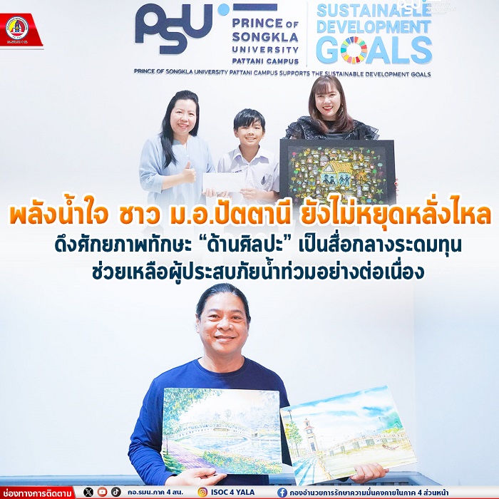 ผศ.ดร.มนทิรา ลีลาเกรียงศักดิ รองอธิการบดีฝ่ายวิชาการ วิทยาเขตปัตตานี กล่าวว่า การให้ความช่วยเหลือสังคมไม่ได้จำกัดเพียงการบริจาคเงินเพียงอย่างเดียวเท่านั้น แต่รวมถึงการใช้ความสามารถและทักษะที่มี ทั้งนักเรียน นักศึกษา คณาจารย์ และบุคลากร นำความสามารถความแตกต่างของแต่ละคนมาเติมเต็มเพื่อช่วยสังคม อย่างเช่นภารกิจวันนี้ที่เห็นได้ชัดเจนจาก การเปิดประมูลผลงานศิลปะ จากนักเรียนของโรงเรียนสาธิต มหาวิทยาลัยสงขลานครินทร์ และการบริจาคเงินสนับสนุนผ่านผลงานภาพสีน้ำ โดยอาจารย์คณะศึกษาศาสตร์ มหาวิทยาลัยสงขลานครินทร์ วิทยาเขตปัตตานี ขอส่งมอบกำลังใจให้กับทุกท่าน ให้รอดพ้นฝ่าฟันวิกฤตน้ำท่วมครั้งนี้ไปด้วยกัน และขอแสดงความขอบคุณต่อผู้มีจิตศรัทธาและจิตอาสาที่ช่วยเหลือผู้ประสบภัยน้ำท่วมใน 3 จังหวัดชายแดนใต้ ถือเป็นการทำเพื่อสังคมด้วยพลังน้ำใจ นำเอาความรู้ความสามารถและทักษะช่วยกันสร้างผลกระทบเชิงบวกให้กับสังคม ทั้งหมดนี้สะท้อนถึง “พระราชปณิธานของมหาวิทยาลัยที่ว่า “ประโยชน์ของเพื่อนมนุษย์เป็นกิจที่หนึ่ง”