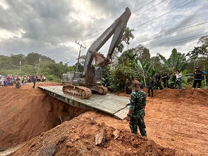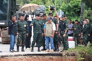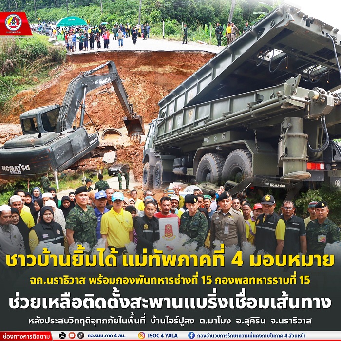 นาย ธีรศักดิ์ สังขโชติ นายอำเภอสุคิริน จังหวัดนราธิวาส เปิดเผยว่า “ หลังจากเกิดสถานการณ์ฝนตกหนักในพื้นที่อย่างต่อเนื่องเป็นระยะเวลาเกือบสองสัปดาห์ บวกกับปริมาณน้ำฝนที่ค่อนข้างมาก ทำให้ปริมาณน้ำเพิ่มสูง น้ำป่าไหลหลาก กระแสน้ำไหลแรงและเชี่ยวกราด ได้กัดเซาะถนนเส้นหลักจนไม่มาสามารถใช้สัญจรไป – มาได้ ซึ่งถนนเส้นนี้เป็นพื้นที่เชื่อม 2 ตำบล คือ ตำบลมาโมง และตำบลภูเขาทอง เดือดร้อนพี่น้องประชาชนจำนวน 14 หมู่บ้าน กว่าพันครัวเรือน ไม่สามารถที่จะเดินทางเข้า – ออกหมู่บ้านไปจัดหาอาหาร หรือดำเนินชีวิตประจำวันได้ และวันนี้รู้สึกดีใจแทนพี่น้องประชาชนเป็นอย่างมาก ที่ พลโท ไพศาล หนูสังข์ แม่ทัพภาคที่ 4 / ผู้อำนวยการรักษาความมั่นคงภายในภาค 4 ได้ส่งต่อความห่วงใยมายังพี่น้องประชาชนในพื้นที่ ผ่าน พลตรี เฉลิมพร ขำเขียว ผู้บัญชาการกองพลทหารราบที่ 15 / ผู้บังคับหน่วยเฉพาะกิจนราธิวาส ในการลงมาพบปะพี่น้องประชาชน รวมไปถึงได้นำกำลังพลและยุทโธปกรณ์จากกองทัพภาคที่ 4 โดยกองพันทหารช่างที่ 15 กองพลทหารราบที่ 15 ค่ายสมเด็จพระสุริโยทัย จังหวัดปัตตานี มาบรรเทาความเดือดร้อนของพี่น้องประชาชนในเบื้องต้น“