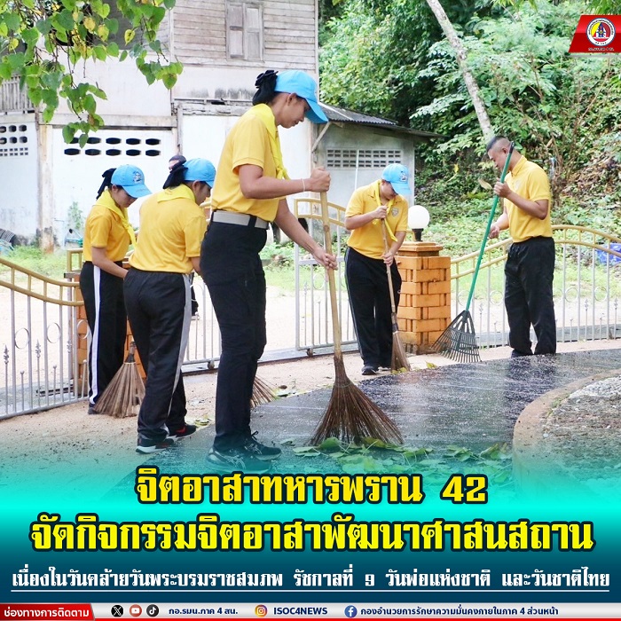 วันที่ 5 ธันวาคม 2567 เวลา 08.30 น. ที่ วัดควนใน ตำบลควน อำเภอปะนาเระ จังหวัดปัตตานี หน่วยเฉพาะกิจกรมทหารพรานที่ 42 จัดกำลังพลจิตอาสาพระราชทาน ร่วมกิจกรรมจิตอาสาพัฒนาศาสนสถานเนื่องในวันคล้ายวันพระบรมราชสมภพ พระบาทสมเด็จพระบรมชนกาธิเบศร มหาภูมิพลอดุลยเดชมหาราช บรมนาถบพิตร รัชกาลที่ 9 วันพ่อแห่งชาติ และวันชาติไทย โดยการทำความสะอาดปรับปรุงภูมิทัศน์ บริเวณโดยรอบของวัดควนใน และบริเวณที่ตั้งหน่วย เพื่อถวายเป็นพระราชกุศลแด่พระบาทสมเด็จพระปรมินทรมหาภูมิพลอดุลยเดช บรมนาถบพิตร รัชกาลที่ 9 เป็นโอกาสให้คนไทยทุกคนได้ร่วมกันแสดงความจงรักภักดี และน้อมรำลึกถึงพระมหากรุณาธิคุณอันหาที่สุดมิได้ของพระองค์ท่าน