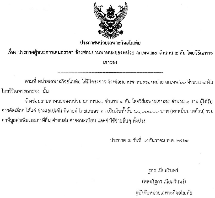 จัดซื้อ จัดจ้างประกาศผู้ชนะการเสนอราคา ประกาศผู้ชนะการเสนอราคา จ้างซ่อมยานพาหนะของหน่วย ฉก.ทพ.20 จำนวน 4 คัน โดยวิธีเฉพาะเจาะจง (60,000.00) December 27, 2020 1163 Share Facebook Twitter Google+ Telegram LINE ฉก.อโณทัย