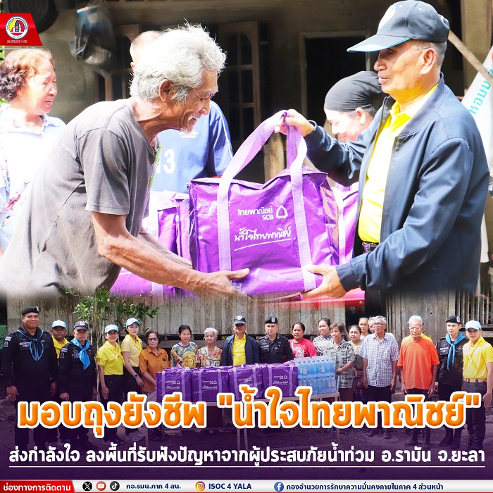 วันที่ 5 ธันวาคม 2567 พลเอก มณี จันทร์ทิพย์ ที่ปรึกษา กองอำนวยการรักษาความมั่นคงภายในภาค 4 ส่วนหน้า / เลขาธิการศูนย์พัฒนาและส่งเสริมพระพุทธศาสนาจังหวัดชายแดนภาคใต้ (ศสพ.จชต.) ลงพื้นที่เยี่ยมเยียนและให้กำลังใจประชาชนที่ได้รับผลกระทบจากอุทกภัย พร้อมทั้งสอบถามปัญหา ข้อขัดข้องต่าง ๆ รวมถึงมอบถุงยังชีพ “น้ำใจไทยพาณิชย์” ซึ่งได้รับการสนับสนุนจากธนาคารไทยพาณิชย์ จำกัด (มหาชน) ให้กับประชาชนในพื้นที่ ตำบลตะโล๊ะหะลอ, ตำบลกายูบอเกาะ, และ ตำบลเนินงาม อำเภอรามัน จังหวัดยะลา เพื่อบรรเทาความเดือนร้อน รวมทั้งประสานงานบูรณาการร่วม ในการให้ความช่วยเหลือ เยียวยา สำหรับผู้ที่ได้รับความเสียหายค่อนข้างหนัก โดยมี พันเอก พงศกร แสงกุล ผู้บังคับหน่วยเฉพาะกิจกรมทหารพรานที่ 41 พร้อมด้วย ฝ่ายกิจการพลเรือนฯ, กำลังพลจิตอาสา หมวดทหารพรานหญิงฯ, ผู้บังคับกองร้อยทหารพรานหน่วยขึ้นตรง, กำนัน และ ผู้ใหญ่บ้าน ให้การต้อนรับ