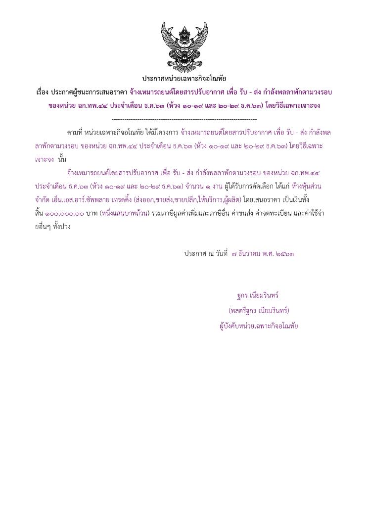 ประกาศผู้ชนะการเสนอราคา จ้างเหมารถยนต์โดยสารปรับอากาศ เพื่อ รับ – ส่ง กำลังพลลาพักตามวงรอบของหน่วย ฉก.ทพ.44 ประจำเดือน ธ.ค.63 (ห้วง 10 – 19 และ 20 – 29 ธ.ค.63) โดยวิธีเฉพาะเจาะจง (100,000.00)