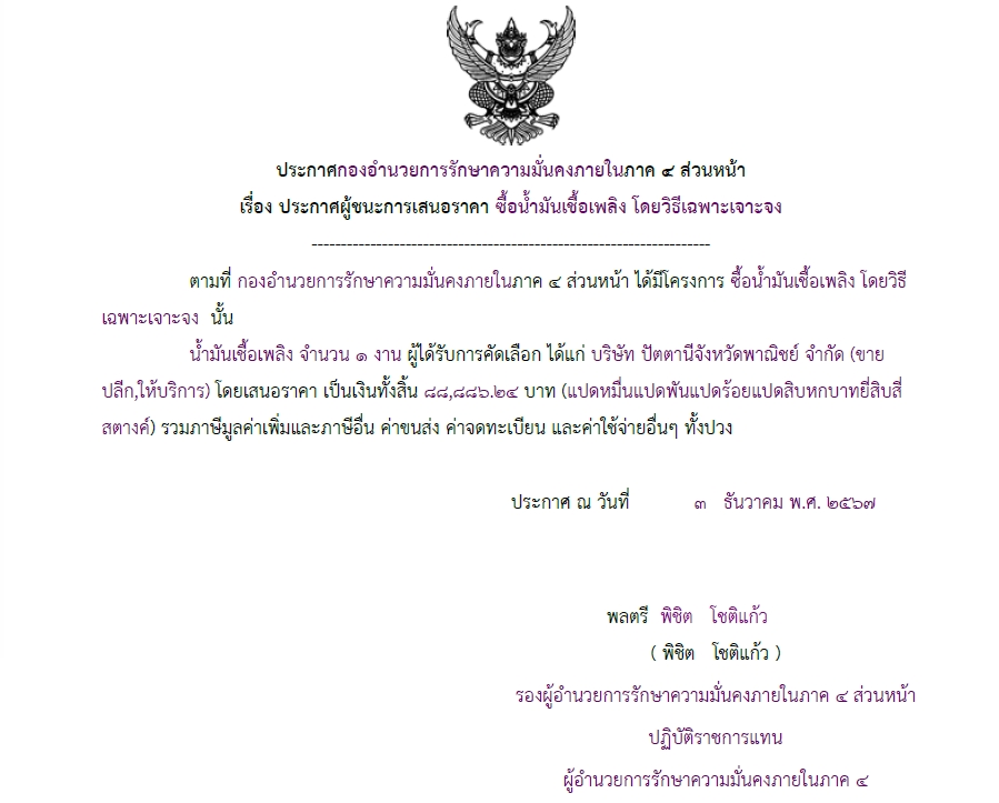 ประการผู้ชนะการเสนอราคา ซื้อน้ำมันเชื้อเพลิง โดยวิธีเฉพาะเจาะจง