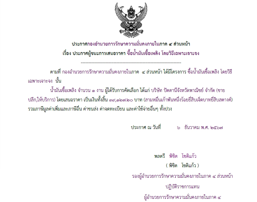 ประการผู้ชนะการเสนอราคา ซื้อน้ำมันเชื้อเพลิง โดยวิธีเฉพาะเจาะจง