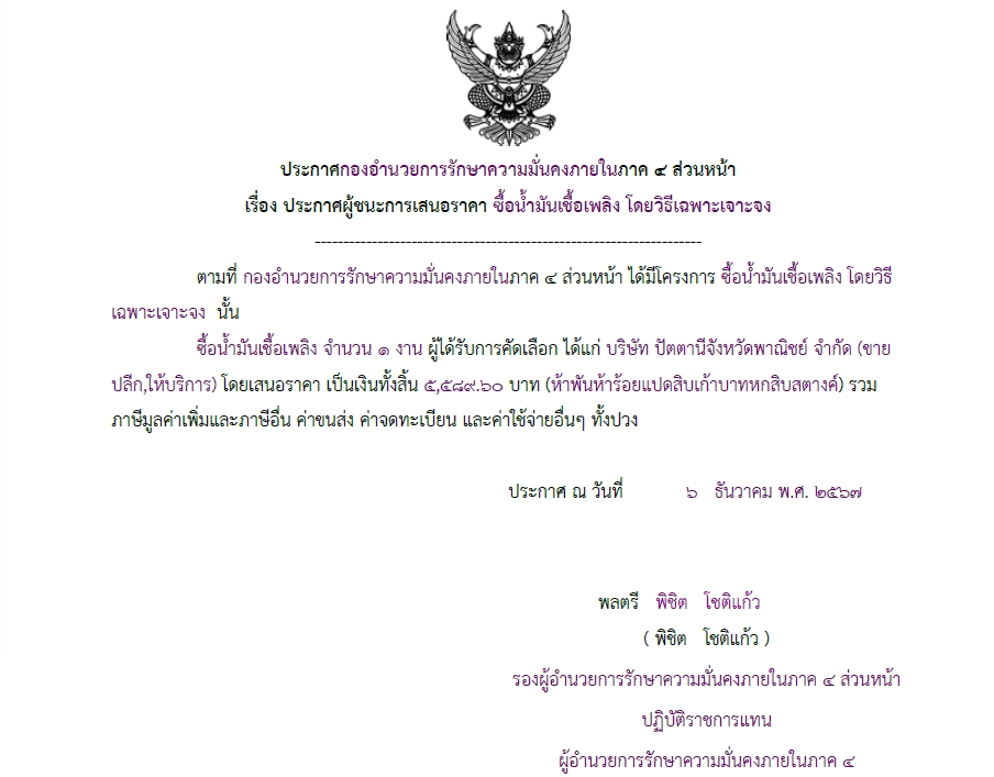 ประการผู้ชนะการเสนอราคา ซื้อน้ำมันเชื้อเพลิง โดยวิธีเฉพาะเจาะจง