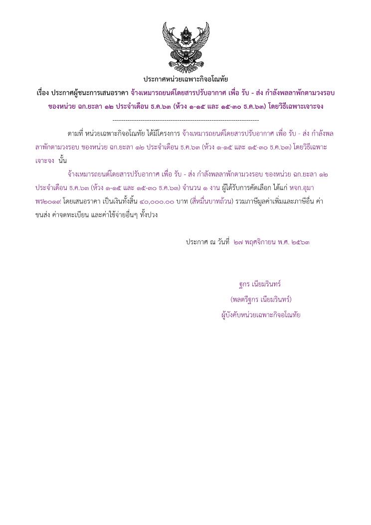 ประกาศผู้ชนะการเสนอราคา จ้างเหมารถยนต์โดยสารปรับอากาศ เพื่อ รับ – ส่ง กำลังพลลาพักตามวงรอบของหน่วย ฉก.ยะลา 12 ประจำเดือน ธ.ค.63 (ห้วง 1 – 15 และ 15 – 30 ธ.ค.63) โดยวิธีเฉพาะเจาะจง (40,000.00)