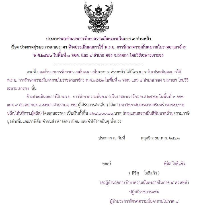จัดซื้อ จัดจ้างประกาศผู้ชนะการเสนอราคา ประกาศผู้ชนะการเสนอราคา จ้างประเมินผลการใช้ พ.ร.บ. การรักษาความมั่นคงภายในราชอาจักร พ.ศ.๒๕๕๑ ในพื้นที่ ๓ จชต. และ ๔ อำเภอ ของ จ.สงขลา โดยวิธีเฉพาะเจาะจง December 11, 2024 320 Share Facebook Twitter Google+ Telegram LINE