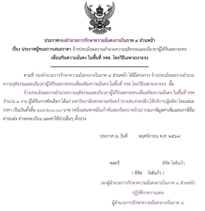 จัดซื้อ จัดจ้างประกาศผู้ชนะการเสนอราคา ประกาศผู้ขนะการเสนอราคา จ้างประเมินผลงานอำนวยความยุติธรรมและเยียวยาผู้ได้รับผลกระทบ เพื่อเสริมความมั่นคง ในพื้นที่ จขต. โดยวิธีเฉพาะเจาะจง December 11, 2024 284 Share Facebook Twitter Google+ Telegram LINE