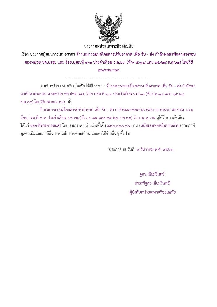 ประกาศผู้ชนะการเสนอราคา จ้างเหมารถยนต์โดยสารปรับอากาศ เพื่อ รับ – ส่ง กำลังพลลาพักตามวงรอบของหน่วย ชค.ปชด. และ ร้อย.ปชด.ที่ 1 -3 ประจำเดือน ธ.ค.63 (ห้วง 5 – 14 และ 15 – 24 ธ.ค.63) โดยวิธีเฉพาะเจาะจง (160,000.00)