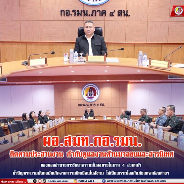 โดย พลตรี กรกฎ ภู่โชติ รองผู้อำนวยการรักษาความมั่นคงภายในภาค 4 ส่วนหน้า เปิดเผยภาพรวมการขับเคลื่อนการปฏิบัติ งานด้านมวลชนของหน่วยในพื้นที่จังหวัดชายแดนภาคใต้ , งานกิจการพลเรือนสนับสนุนการแก้ไขปัญหาความความรุนแรงในพื้นที่จังหวัดชายแดนภาคใต้ ซึ่งกองอำนวยการรักษาความมั่นคงภายในภาค 4 ส่วนหน้า ยังน้อมนำศาสตร์พระราชา “เข้าใจ เข้าถึง พัฒนา” นำทางแก้ไขปัญหา ควบคู่พัฒนาพื้นที่ใช้สภาสันติสุขตำบล และหลัก ฮูกุมปากัต (ธรรมนูญหมู่บ้าน 9 ดี) เน้นภาคประชาสังคมมีส่วนร่วม บูรณาการให้เป็นรูปธรรมตามนโยบายของรัฐบาล เน้นการแก้ปัญหาด้วยสันติวิธี โดยบูรณาการร่วมกับทุกภาคส่วน มุ่งเน้นให้ประชาชนมีความปลอดภัยในชีวิตและทรัพย์สิน สามารถอยู่ร่วมกันอย่างสันติสุขในสังคมพหุวัฒนธรรม ควบคู่กับการพัฒนาคุณภาพชีวิตให้มีความกินดีอยู่ดี ได้มีคุณภาพชีวิตที่ดีขึ้น