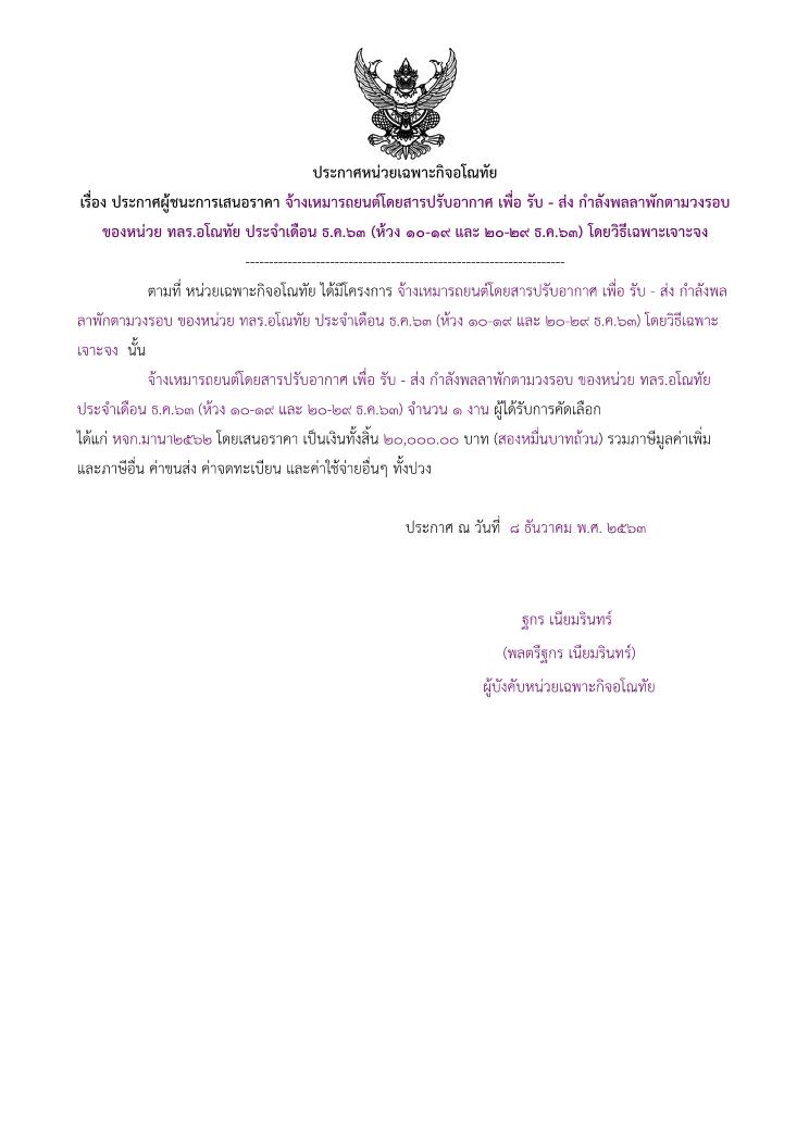 ประกาศผู้ชนะการเสนอราคา จ้างเหมารถยนต์โดยสารปรับอากาศ เพื่อ รับ – ส่ง กำลังพลลาพักตามวงรอบของหน่วย ทลร.อโณทัย ประจำเดือน ธ.ค.63 (ห้วง 10 – 19 และ 20 – 29 ธ.ค.63) โดยวิธีเฉพาะเจาะจง (20,000.00)