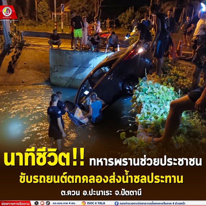 เมื่อวันที่ 11 ธันวาคม 2567 เวลา 18.40 น. กำลังพลจากกองร้อยทหารพรานที่ 4207 หน่วยเฉพาะกิจกรมทหารพรานที่ 42 เร่งให้การช่วยเหลือประชาชนประสบอุบัติเหตุขับรถยนต์ตกคลองส่งน้ำชลประทาน บริเวณข้างฐานปฏิบัติการกองร้อยทหารพรานที่ 4207 หมู่ที่ 3 ตำบลควน อำเภอปะนาเระ จังหวัดปัตตานี เจ้าหน้าที่ทหารพรานจึงได้ร่วมกับประชาชนในพื้นที่ ช่วยประชาชนที่ประสบอุบัติเหตุดังกล่าวออกจากตัวรถ เบื้องต้นผู้ใดได้รับบาดเจ็บ พร้อมทั้งได้ประสานรถยกช่วยกันลากรถคันดังกล่าวขึ้นมาบนถนนได้อย่างปลอดภัย