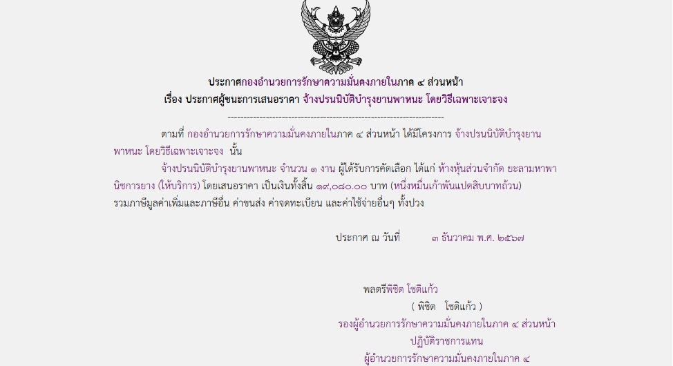 ประกาศผู้ชนะการเสนอราคา จ้างปรนนิบัติบำรุงยานพาหนะ โดยวิธีเฉพาะเจาะจง